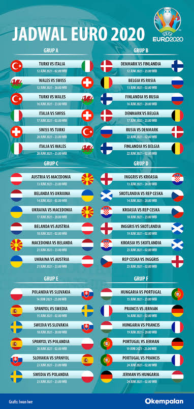 Pertandingan terbesar di benua Eropa akan di mulai pada 12 Juni mendatang, berikut kami sajikan jadwal lengkap pertandingan euro2021.